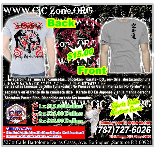 Llegaron Las nuevas camisetas Shotokan Karate Do en negras destacando una de las citas famosas de Gillin Funakoshi " No Pienses En Ganar, Piensa En No Perder " Y en el Frente de la camiseta dice karate do en Japons y en la manga derecha dice Shotokan Puerto Rico. Disponible en Small, Medium, Large
